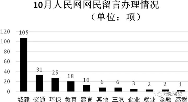经梳理分析,10月份留言最多的是城建方面,共105项,占总留言量的50.2%。其次是交通、环保、教育等方面,分别为31项、25项、18项,占总留言量的14.8%、12%、8.6%。承办留言较多的县(区)和市直单位为濮阳县、华龙区、市城市管理局、市国土资源局。分别为40项、34项、22项、14项,共占留言总量的28.7%。